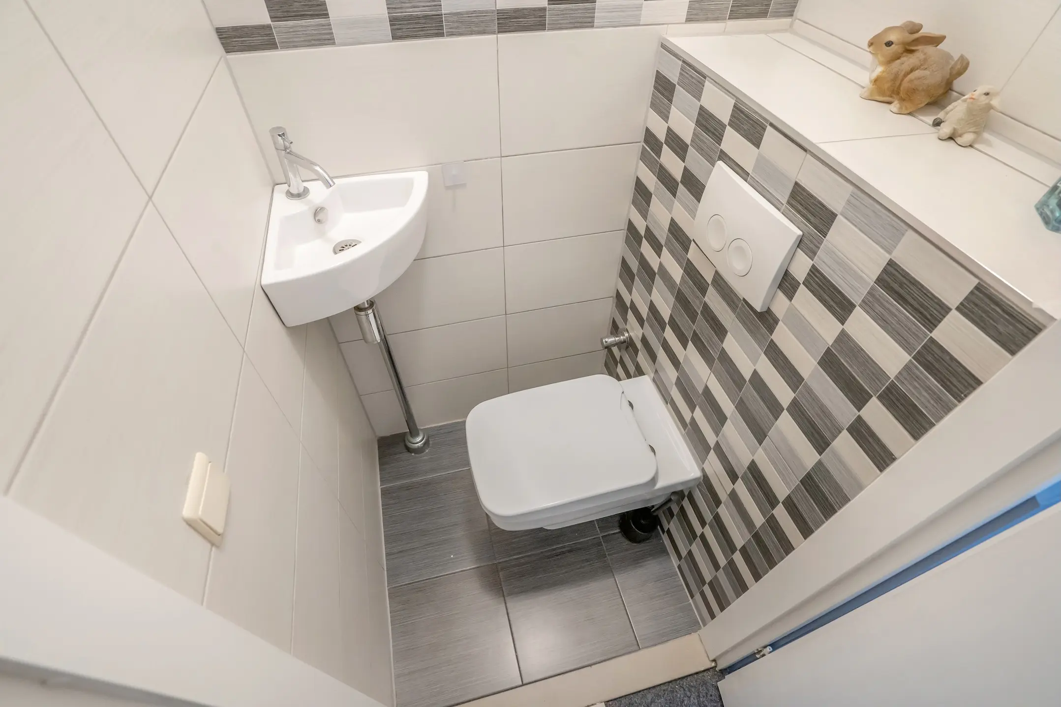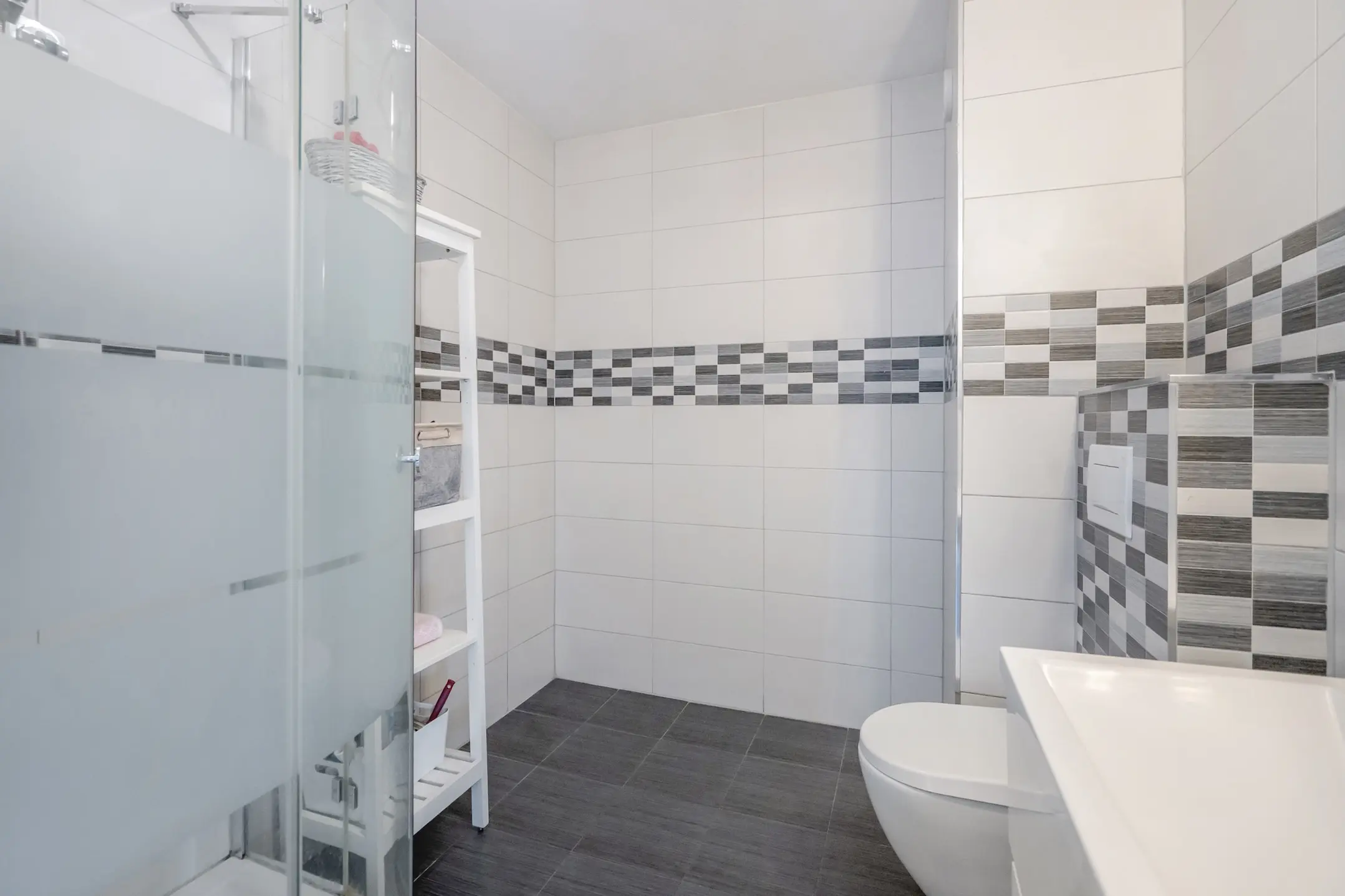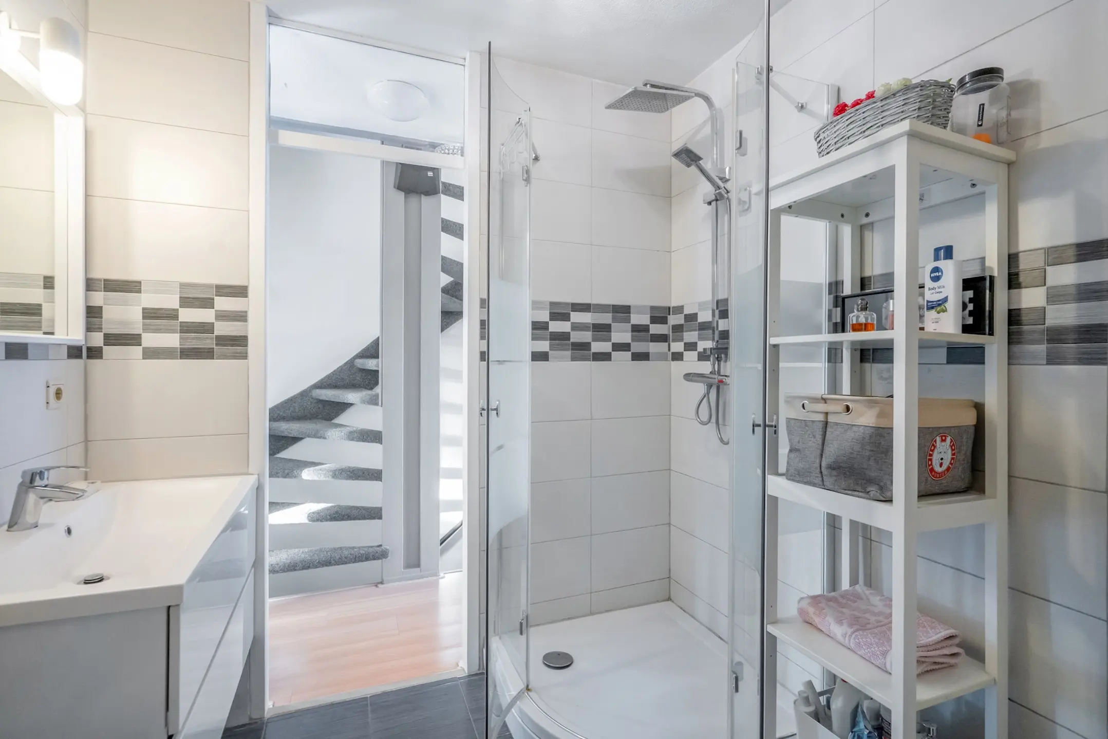 Moderne, lichtkleurig uitgevoerde badkamer met een kwartronde douchecabine, een wastafelmeubel met twee lades en een tweede wandcloset.