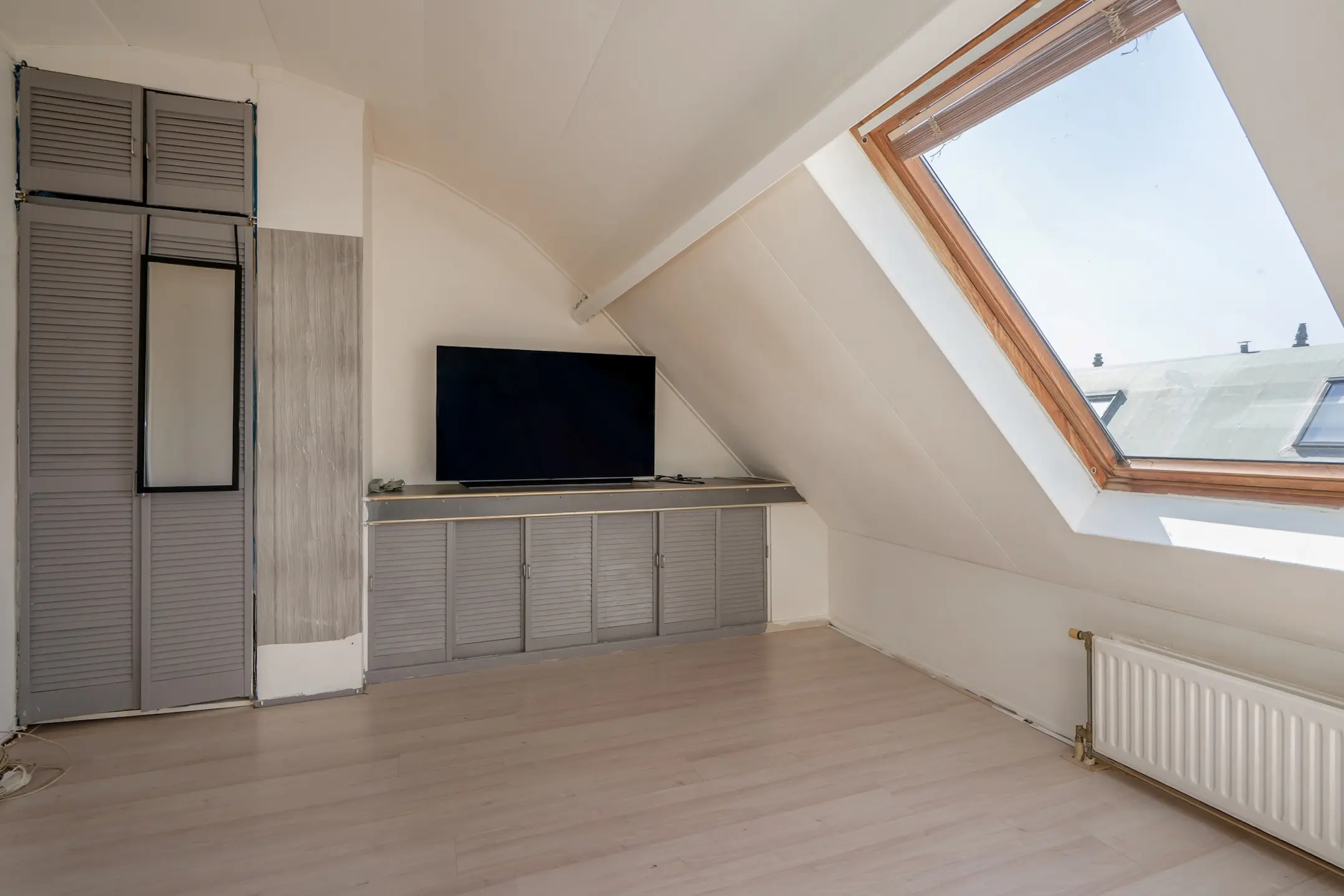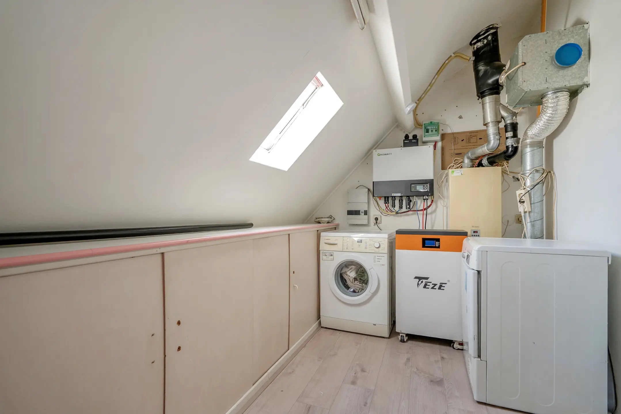 Tweede verdieping: royale, multifunctionele ruimte met de opstelpaats van de wasmachine, wasdroger, de omvormer en de thuisaccu. Bergruimte in de schuine dakvlakken, afsluitbaar middels schuifdeuren.