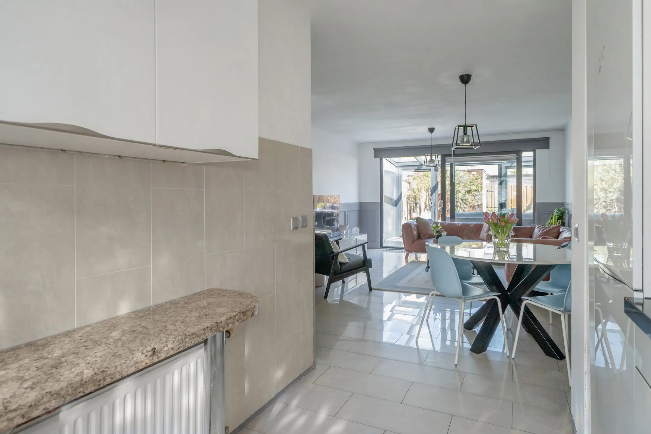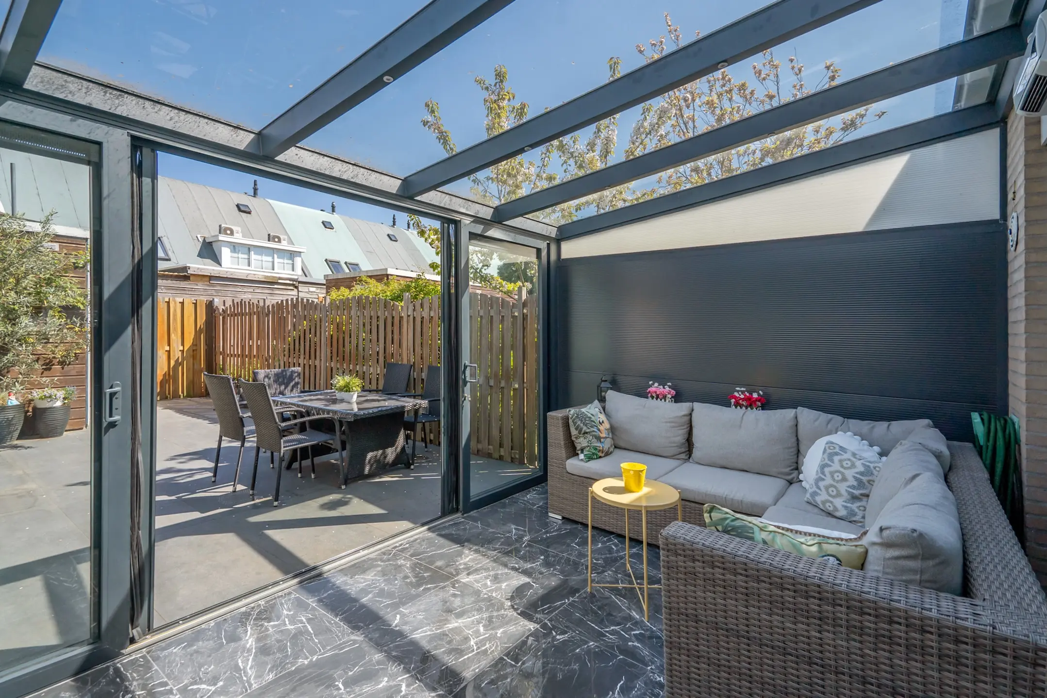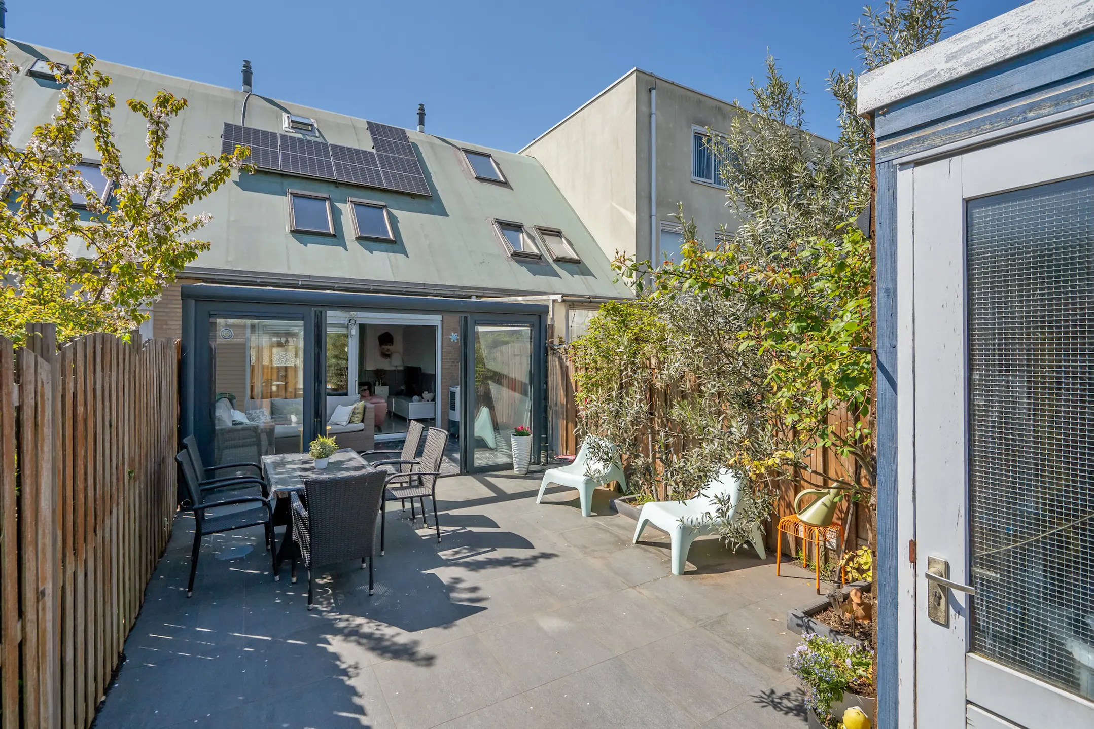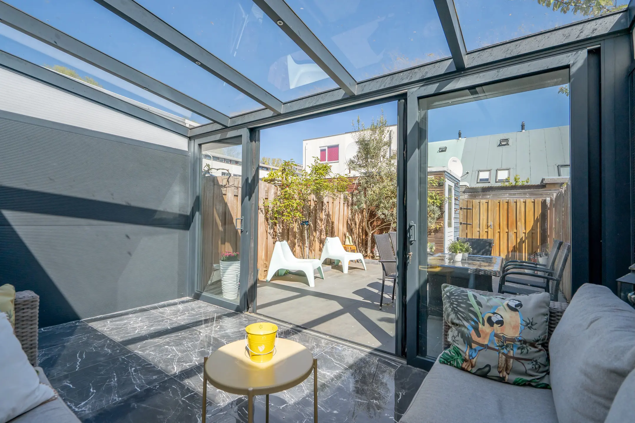 Via de schuifpui toegang tot de serre (ca. 6 jaar oud) met veel licht, dubbele deuren naar de achtertuin op het noordoosten. De voor- en achtertuin zijn volledig betegeld.