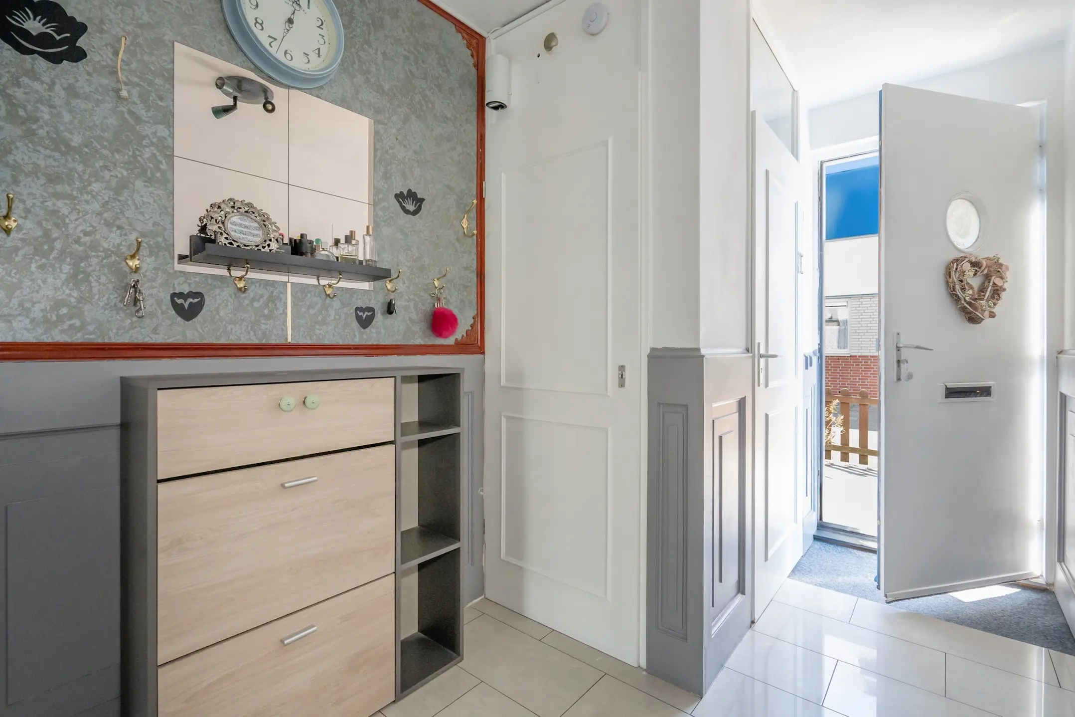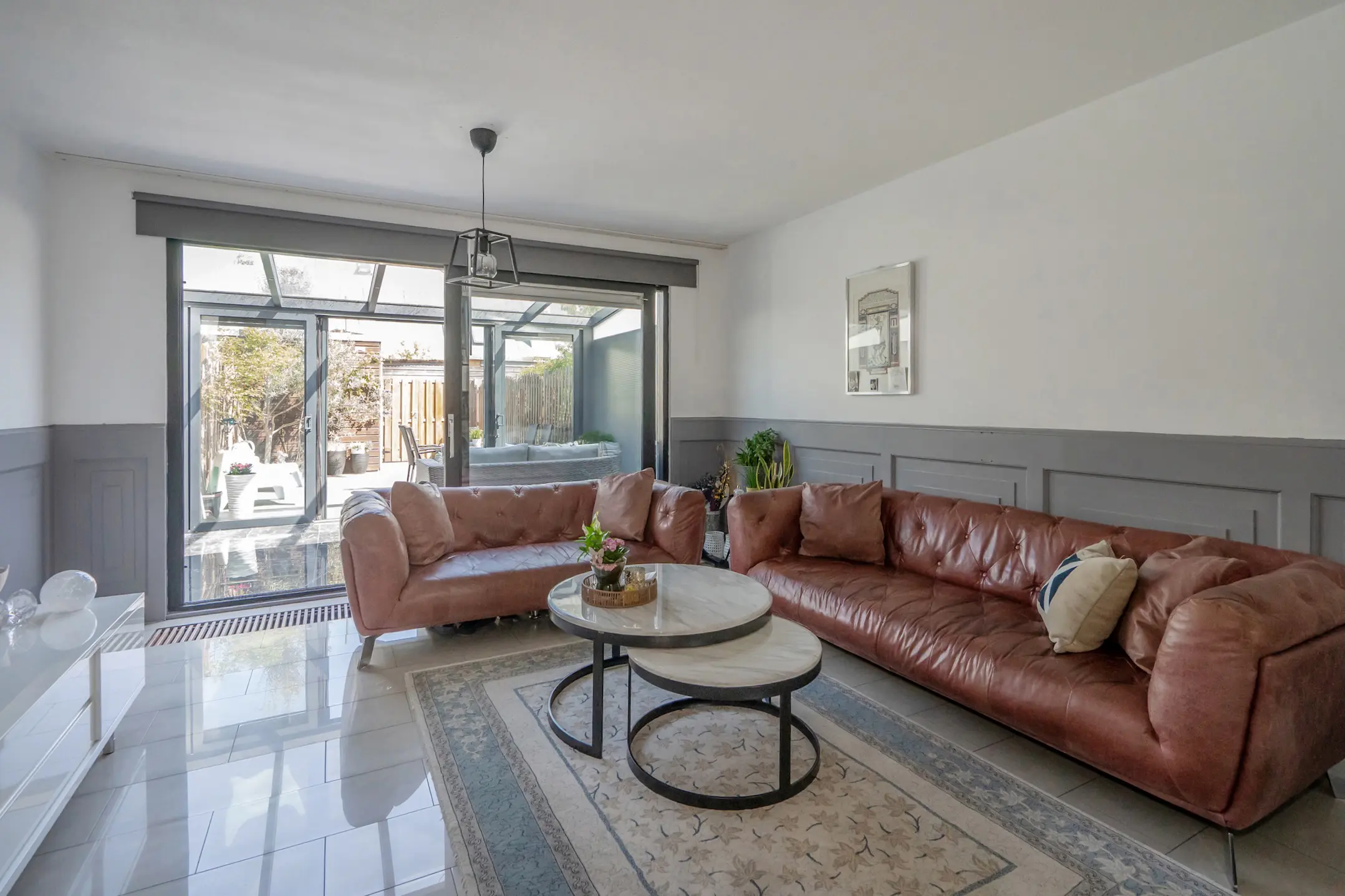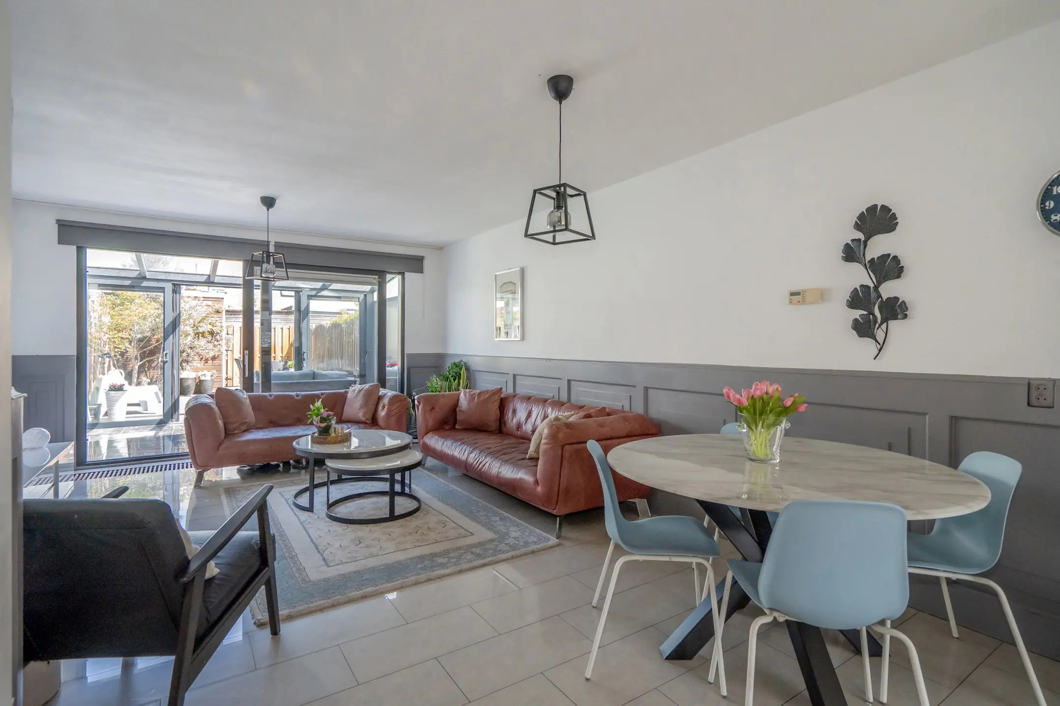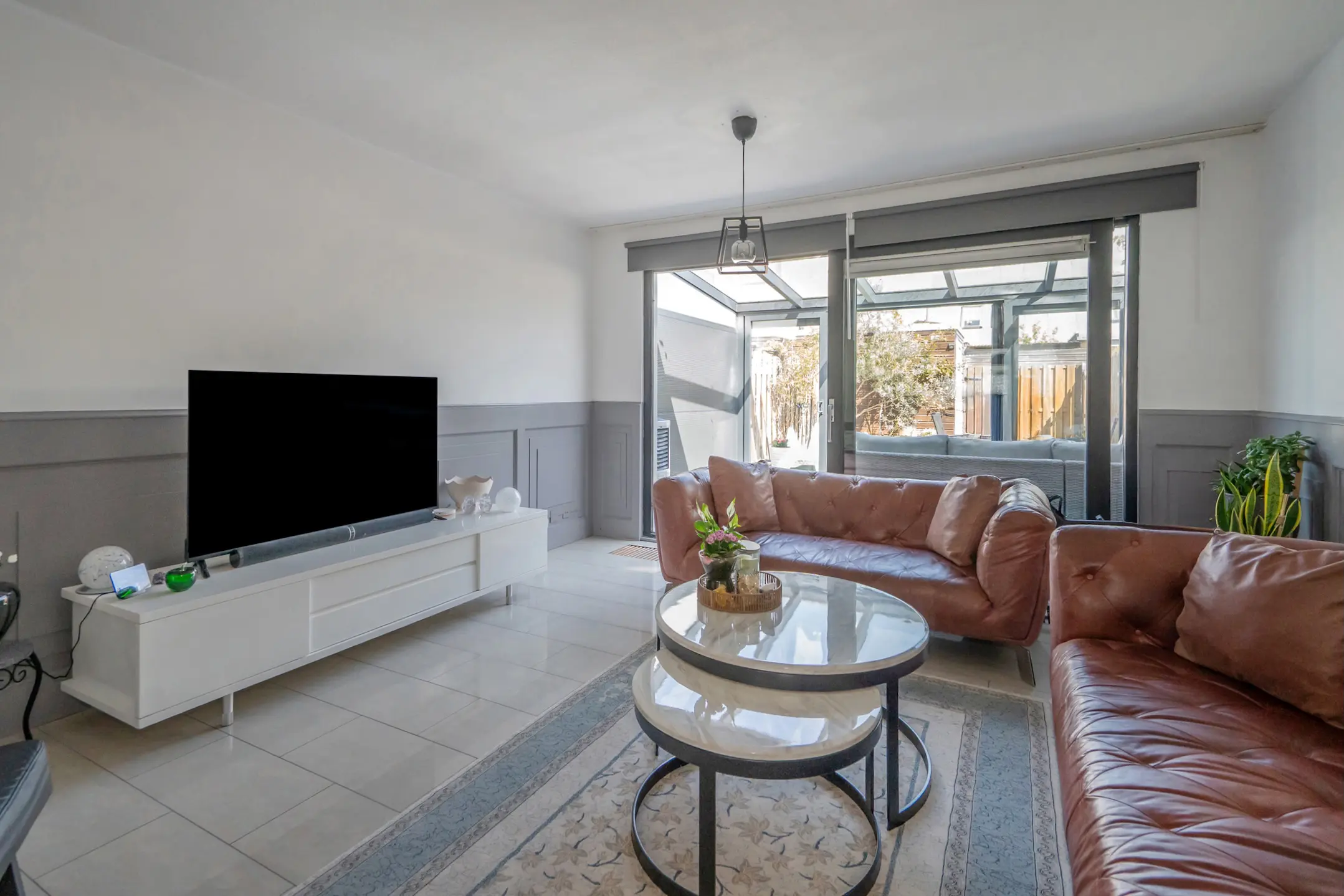 Via de schuifpui toegang tot de serre (ca. 6 jaar oud) met veel licht, dubbele deuren naar de achtertuin op het noordoosten. De voor- en achtertuin zijn volledig betegeld.
