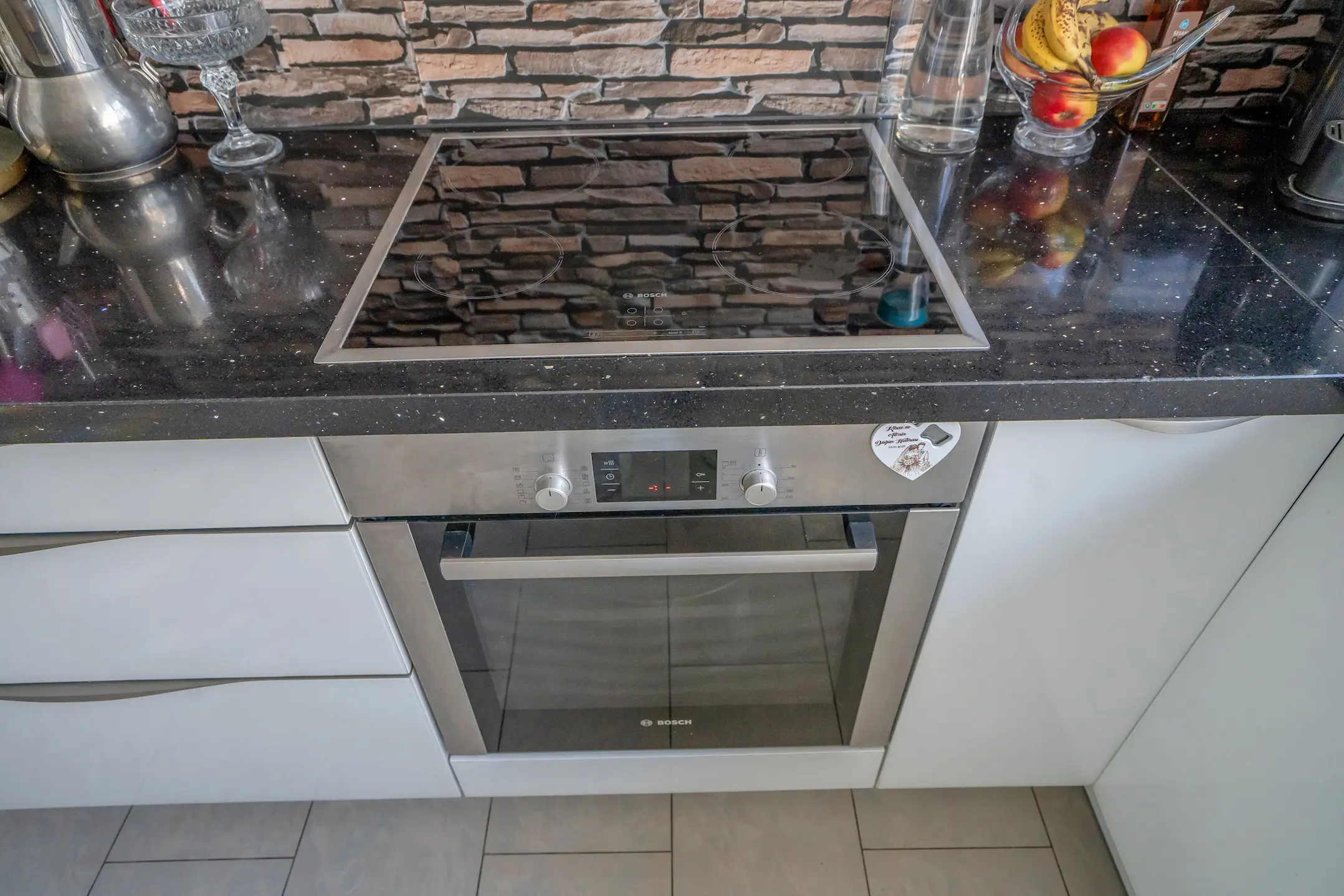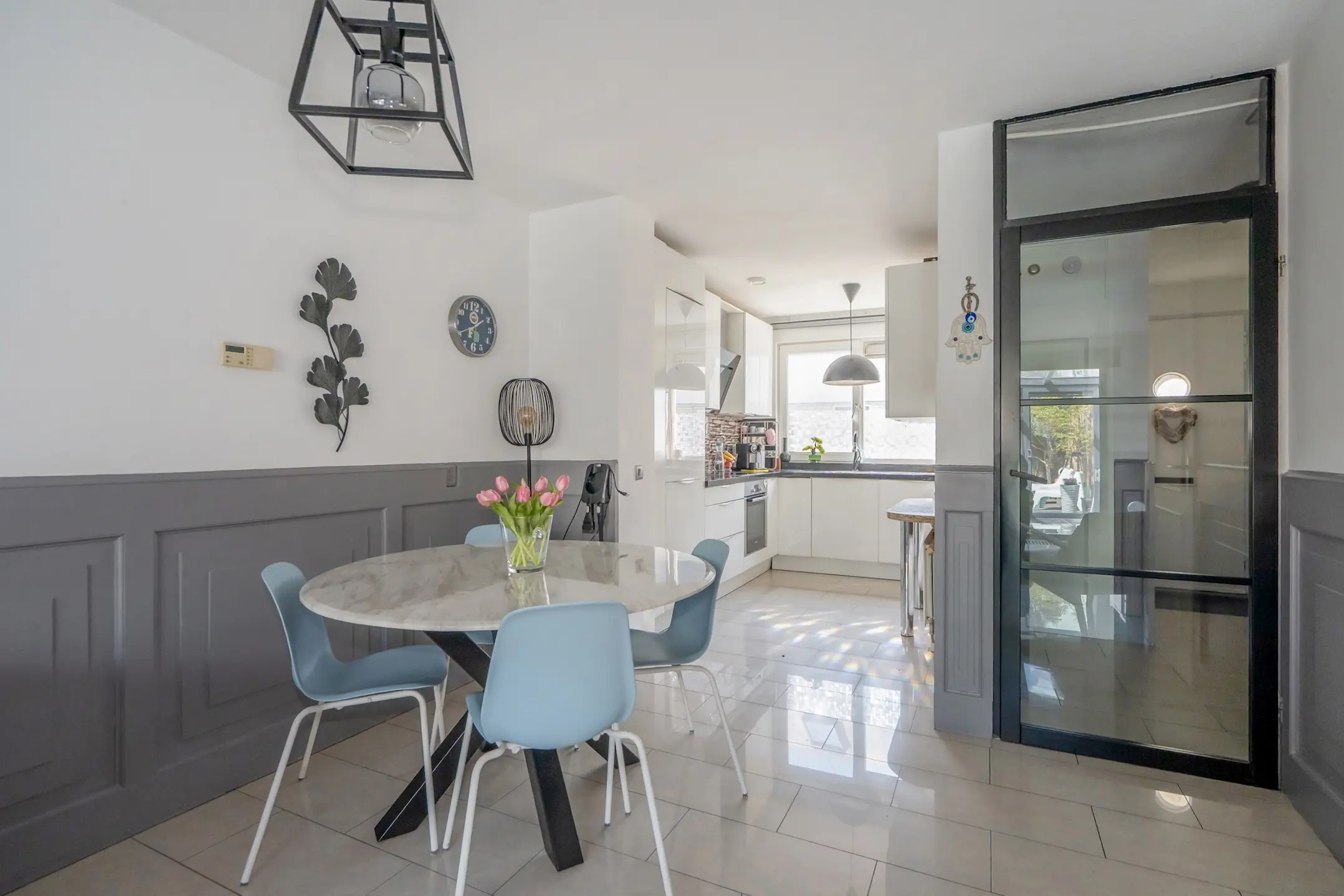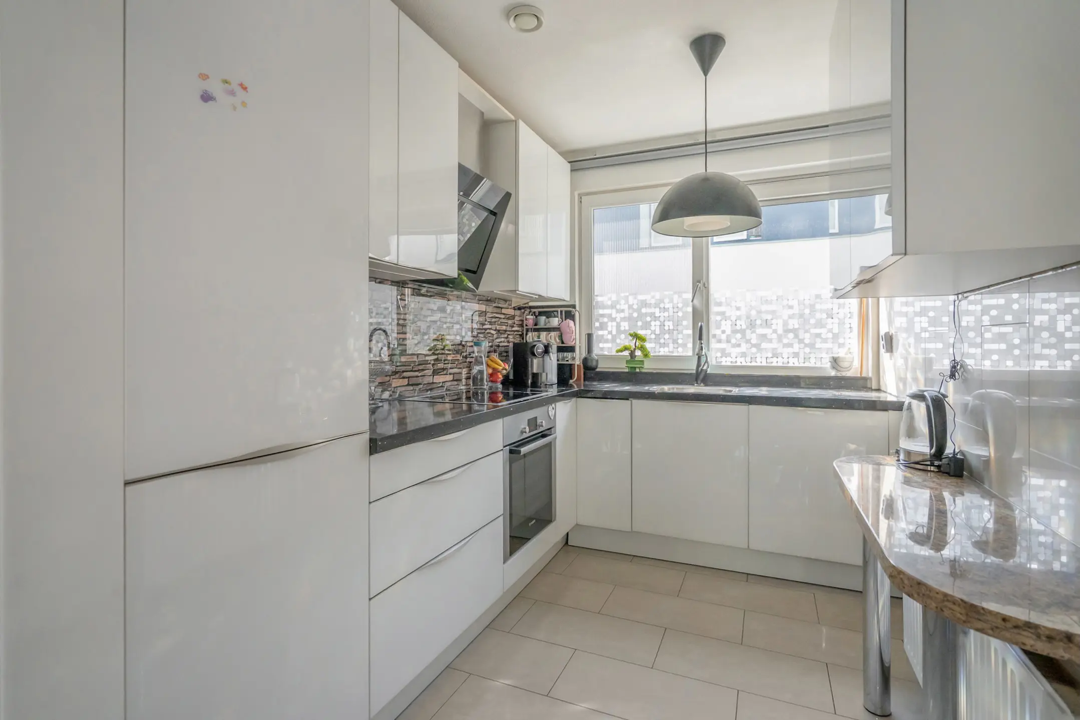 Begane grond: toegang tot de woning middels voortuin, ruim woningentree met een modern uitgevoerd toilet voorzien van een wandcloset en een hoekfonteintje, via industrieel vormgegeven deur toegang tot de heerlijk ruime woon-/eetkamer met de open keuken aan de voorzijde. De begane grond is voorzien van een tegelvloer met vloerverwarming. Strak uitgevoerde keukeninrichting in een hoekopstelling, groot raam met een aangename lichtinval. Geïntegreerde koel-/vriescombinatie, vaatwasser (ca. 3 jaar oud), keramische kookplaat, combi oven en een afzuigkap.