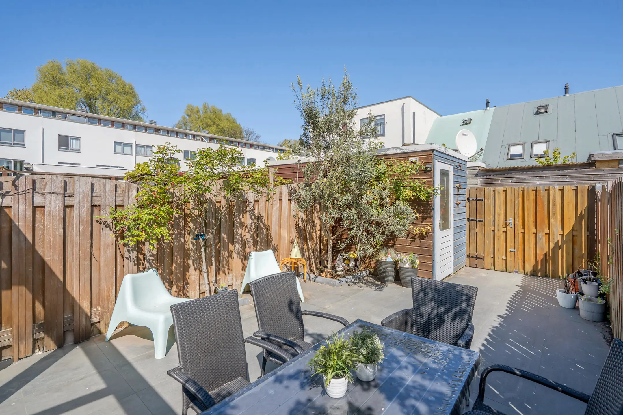 Houten buitenberging en een achterpad.